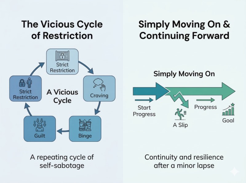 過度限制產生渴望,渴望積累成失控,失控之後自責,自責讓你更想吃,形成一個循環。
