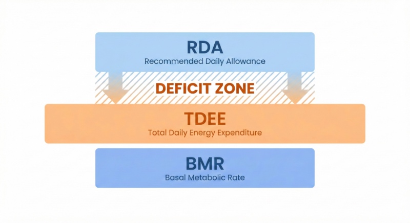 三者的關係是:BMR是地板,TDEE是你實際消耗,RDA是你的飲食目標。