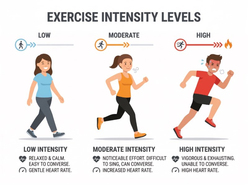 - 低強度(最大心率 50–60%): 輕鬆散步、緩慢騎車,可以完整說句子,甚至聊天