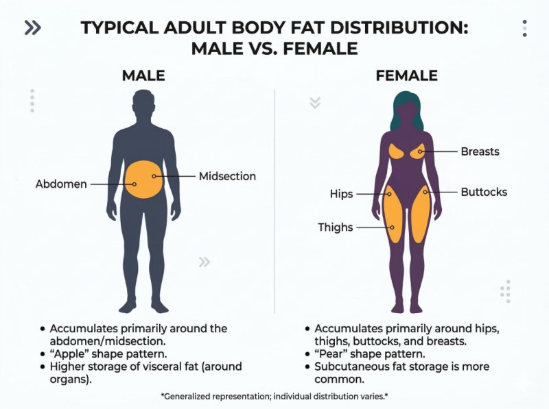 脂肪不是隨機分佈在身體上的。它的位置受荷爾蒙控制,而女生和男生的荷爾蒙結構不一樣,脂肪囤積的偏好也就不一樣。