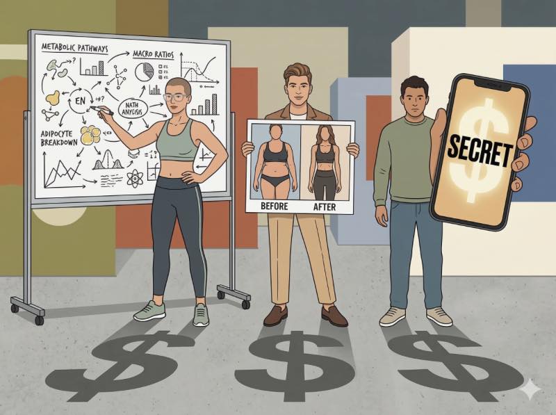 整個減脂產業都建立在這個基礎上。教練、網紅、冷知識帳號,三種角色,用的是同一套運作邏輯,只是包裝不同。